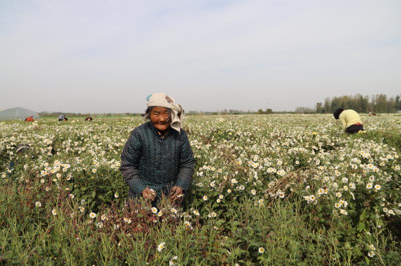 “這活兒輕,像摘棉花一樣,權(quán)當(dāng)閑著沒事兒來玩兒了。我這年齡大了,不比他們年輕人,一天才掙五六十文兒?!?6歲的脫貧致富戶晉秀云來自晉老家行政村閆莊村,和老伴陳克平相依相伴。就這樣在村里打個(gè)零工,幫助種植合作社除草、施肥、摘花、澆水,再加上黨委政府的照顧,二人順利脫貧。“關(guān)鍵是干這活兒甜蜜呀,聽說這菊花賣到外地都是有錢人泡茶喝的,俺這貧困戶能嘗到第一道鮮兒。”說著,晉秀云挑一朵開得艷的菊花放進(jìn)口中,臉上露出了幸福的笑容。