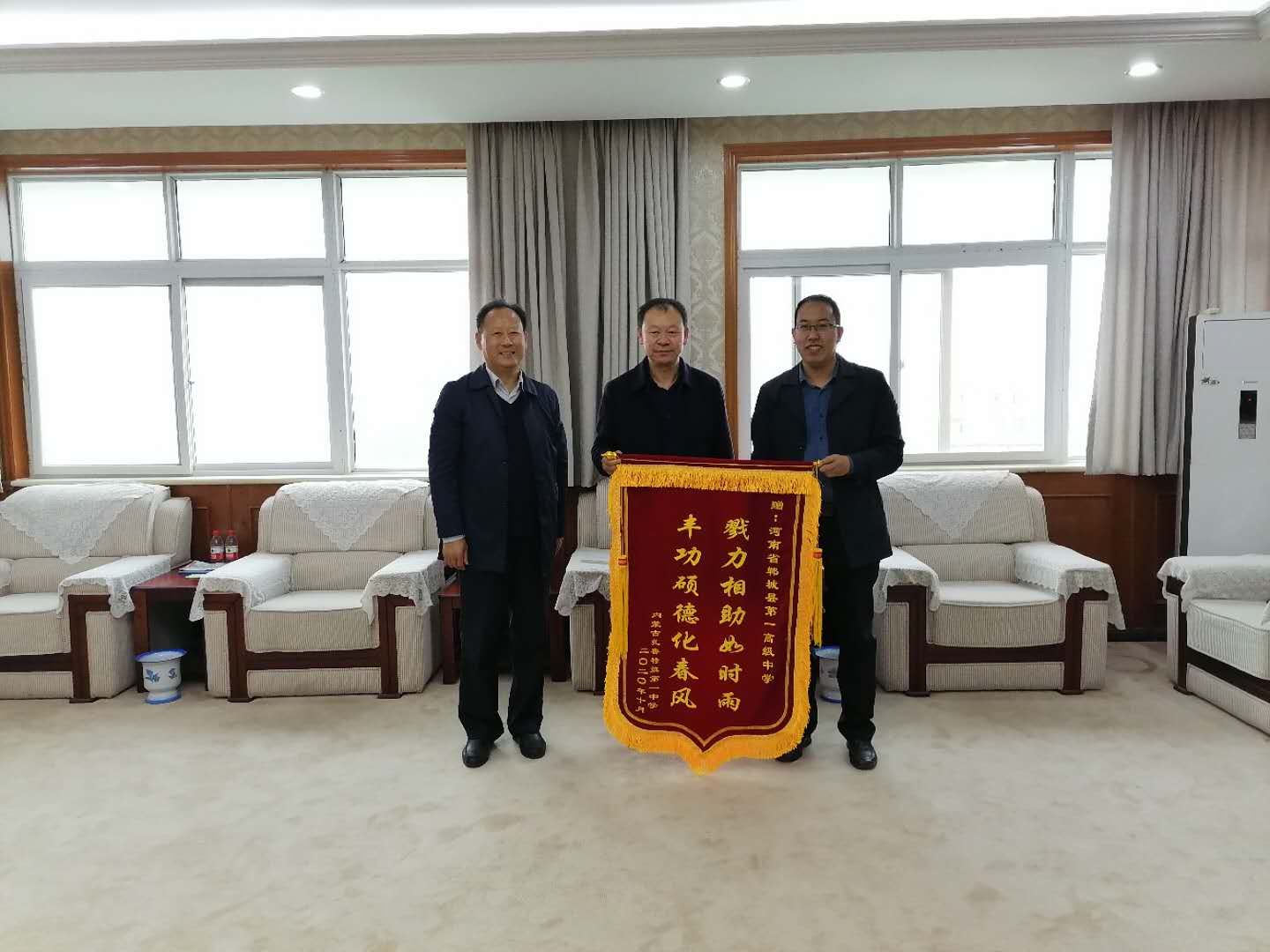近日,內(nèi)蒙古自治區(qū)通遼市扎魯特旗第一中學(xué)校長劉思超為感謝鄲城一高,特意從1700多公里外趕來,贈送一面“豐功碩德化春風(fēng) 戮力相助如時雨”錦旗。鄲城縣政府督學(xué)王平崇參加贈送儀式。