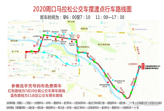 此外, 記者還從大賽組委會(huì)獲悉,2020周口馬拉松比賽公交車(chē)擺渡點(diǎn)行車(chē)路線圖也已公布,參賽選手憑號(hào)碼布可以免費(fèi)乘車(chē),去時(shí)乘車(chē)路線為:文明路口——工農(nóng)路口——大慶路停車(chē)點(diǎn)——慶豐街——景園停車(chē)點(diǎn)——奧蘭停車(chē)點(diǎn)——公務(wù)員A區(qū)停車(chē)點(diǎn)——建業(yè)北門(mén)停車(chē)點(diǎn)周口大道——碧桂園停車(chē)點(diǎn)——堤頂北路——武盛大道——引黃調(diào)蓄風(fēng)景區(qū)門(mén)口擺渡車(chē)乘車(chē)起點(diǎn);回來(lái)時(shí)路線為:引黃調(diào)蓄風(fēng)景區(qū)——武盛大道——堤頂北路——碧桂園停車(chē)點(diǎn)——周口大道——慶豐街——建業(yè)北門(mén)停車(chē)點(diǎn)——公務(wù)員A區(qū)停車(chē)點(diǎn)——奧蘭停車(chē)點(diǎn)——景園停車(chē)點(diǎn)——大慶路停車(chē)點(diǎn)——七一路,其中班車(chē)運(yùn)行時(shí)間為早6:00至7:10,11:00至17:30。因場(chǎng)地受限,活動(dòng)當(dāng)天的停車(chē)區(qū)域分為兩處,一是引黃調(diào)蓄風(fēng)景區(qū)西門(mén)南北兩側(cè)便道;二是風(fēng)景區(qū)西門(mén)向南路西600米處東西無(wú)名路。