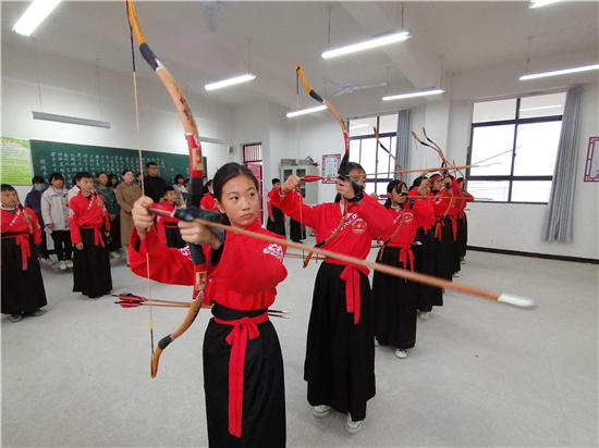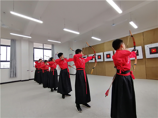 在皮營學?;顒邮?,學校舞蹈社團的小朋友展示了傳統(tǒng)儀式《鹿鳴》,深情的演繹,展示了他們對國學經典的理解。禮射是禮樂文明重要組成部分,習射先習禮,射以觀德。習射可以強健體魄,其中還蘊含了眾多古人先賢的智慧。皮營學校禮射興趣班的小朋友進行禮射表演,隨著挾矢,正筈,審固,舉弓,引彀,發(fā)矢,斂弓,執(zhí)弦等一系列指令,拈弓搭弦展示禮射八法。在這里,學生們通過不同方式的展示,詮釋自己對“禮”“樂”的理解和認知。