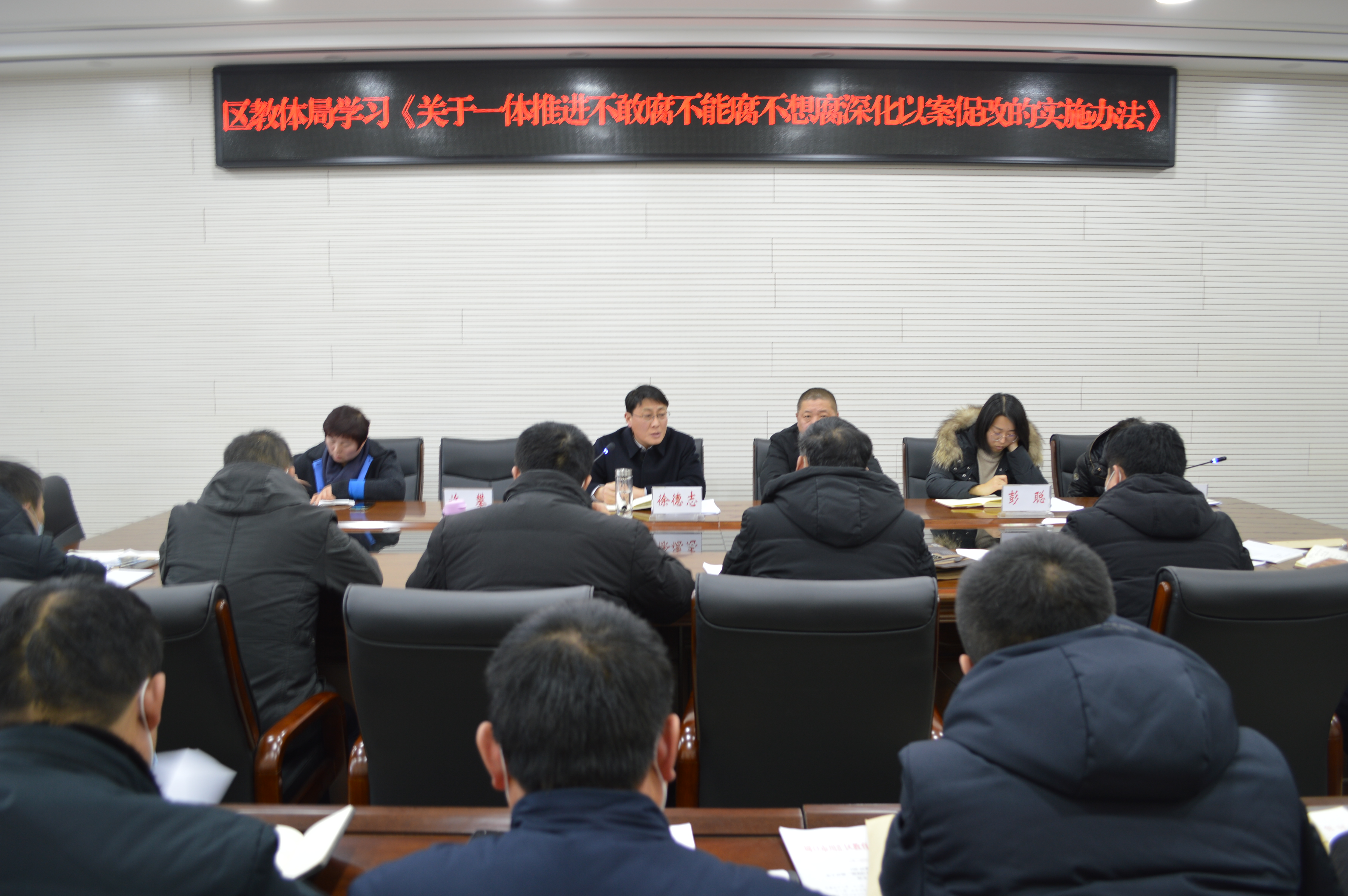 川匯區(qū)教體局黨組書記、局長徐德志強(qiáng)調(diào),要把思想和行動(dòng)統(tǒng)一到一體推進(jìn)“三不”深化以案促改工作中,通過反思剖析教育體育系統(tǒng)近年來發(fā)生的違紀(jì)違法案件,深入查找風(fēng)險(xiǎn)漏洞,強(qiáng)化警示教育,整改突出問題,健全完善制度,促進(jìn)權(quán)力結(jié)構(gòu)配置更加科學(xué)、權(quán)力運(yùn)行更加規(guī)范透明,教育引導(dǎo)黨員干部堅(jiān)定理想信念、增強(qiáng)黨性觀念、提高道德修養(yǎng)、強(qiáng)化紀(jì)律意識,一體推進(jìn)不敢腐不能腐不想腐機(jī)制建設(shè),持續(xù)營造學(xué)的氛圍、嚴(yán)的氛圍、干的氛圍,為推動(dòng)全區(qū)教育體育事業(yè)高質(zhì)量發(fā)展提供堅(jiān)強(qiáng)的政治保證。