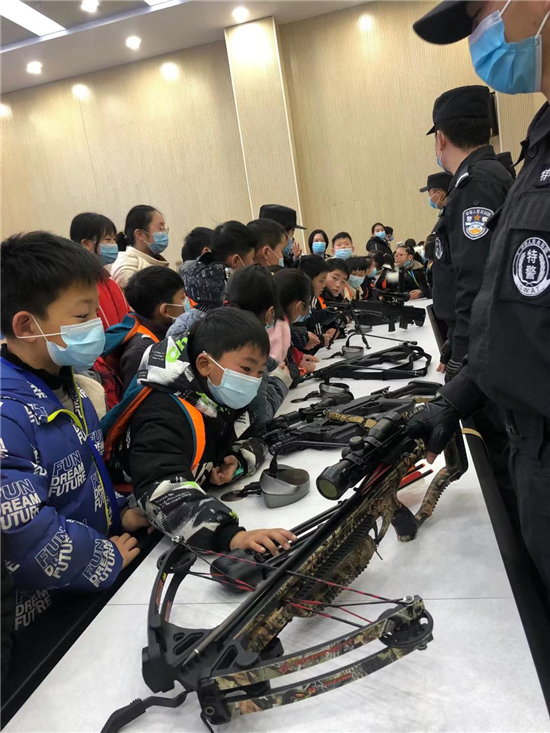 在指揮中心大廳,小記者們還有序參觀了現(xiàn)場展示的特殊警用裝備。除了手槍外,還有沖鋒槍、狙擊步槍、激光炫目槍和強力弓弩等。市公安局特警支隊民警向小記者們介紹了各種槍支及裝備的性能和使用方式,并邀請小記者觸摸一把警用槍械。