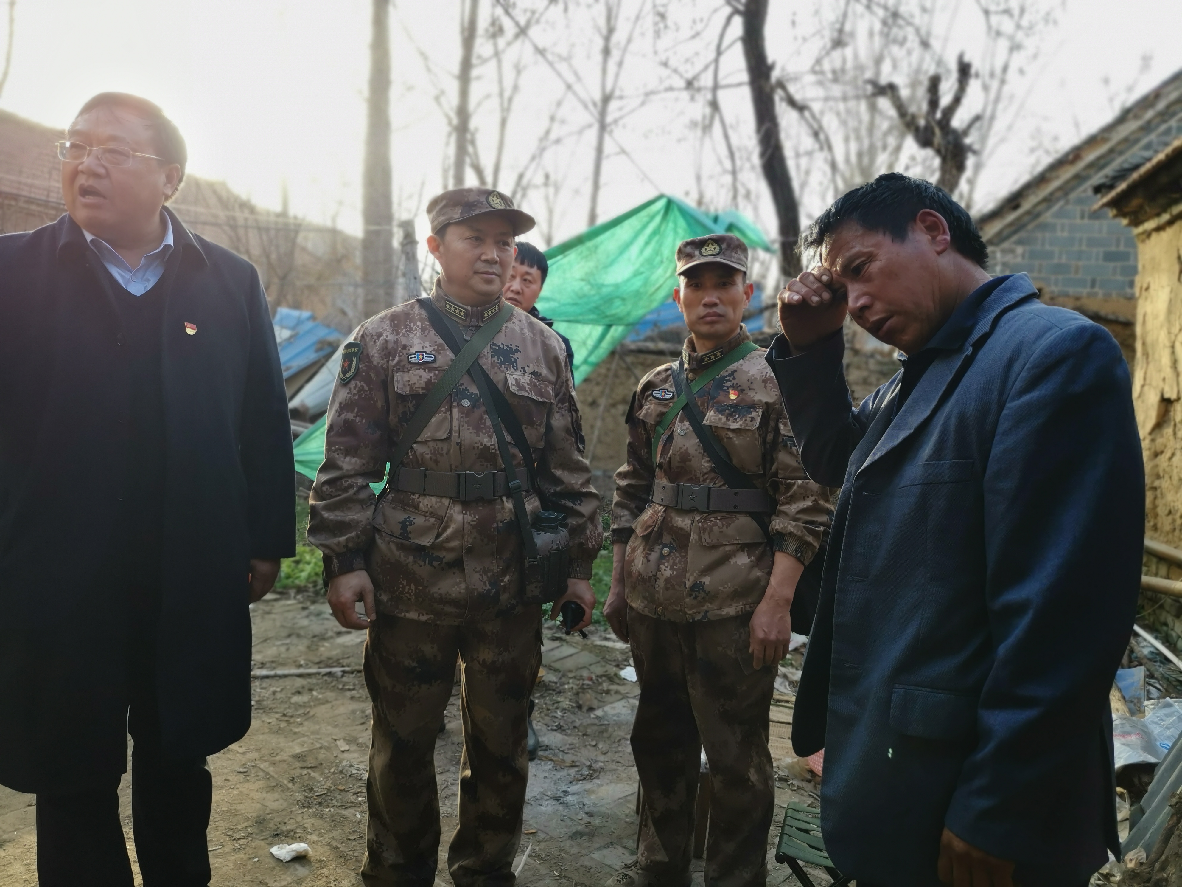 周口軍分區(qū)還將政治工作貫穿于野營(yíng)拉練全過(guò)程,當(dāng)行至周口港區(qū)苑寨行政村時(shí),薛振喜、周口軍分區(qū)政治工作處主任李揚(yáng)以及川匯區(qū)人武部部長(zhǎng)陳繼芳、政委高新傳等來(lái)到貧困戶苑立中家中慰問(wèn),為他們送去米面糧油等慰問(wèn)品。看著簡(jiǎn)陋的房屋,得知苑立中獨(dú)自一個(gè)人拉扯3個(gè)孩子的艱辛生活后,薛振喜囑咐當(dāng)?shù)卣臀溲b部門要想辦法幫扶這戶貧困家庭。 苑立中激動(dòng)地流下眼淚,握著薛振喜的手連聲感謝。