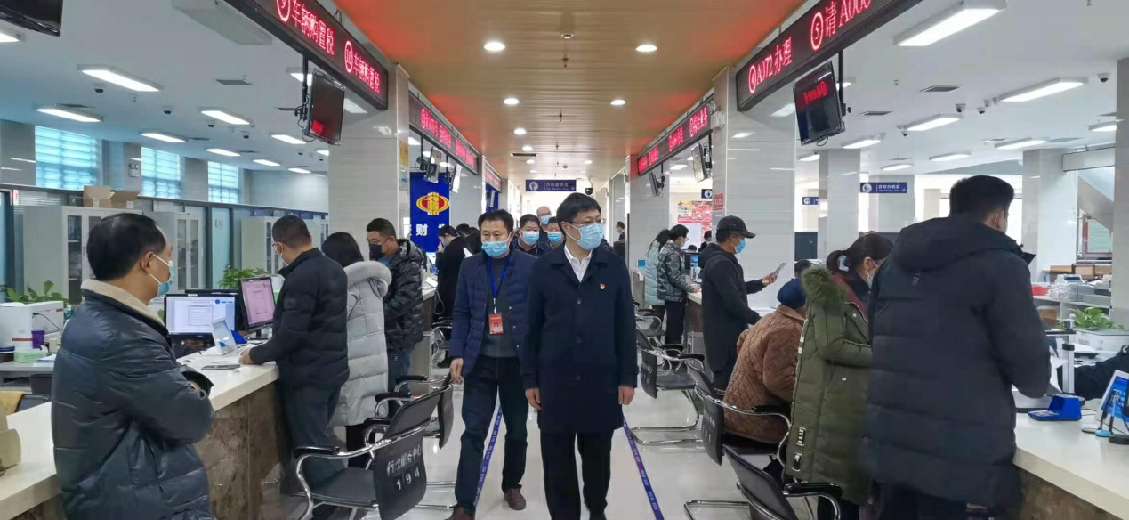 史凱歌、郝寶杰一行對政務服務大廳人員信息登記情況、人員管理、“一米線”落實等相關工作逐一進行檢查,并詳細了解每日辦件數(shù)量、通風消毒等措施落實到位情況。