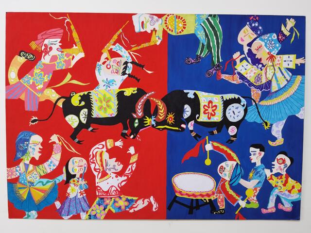 2020年4月,錢玉燕無意中看到“決勝全面小康”第二屆全國農(nóng)民畫展覽征稿啟事,對農(nóng)村生活非常熟悉的她決定一試。她立足于周口平原農(nóng)區(qū)的特色,深深領(lǐng)悟周口幾千年來的農(nóng)耕文化,對參賽作品進行了認真、系統(tǒng)地構(gòu)思,最終決定以歡慶豐收的斗?;顒訛轭}材,把農(nóng)耕文化的深遠、厚重與豐富的藝術(shù)表現(xiàn)手法相融合。她采用普通的繪畫卡紙,運用多種繪畫顏料,充分借鑒漢畫藝術(shù),吸收中原地區(qū)的剪紙文化、西方藝術(shù)大師畢加索立體畫派的藝術(shù)風格和古埃及畫的靈感,以艷麗的紅、藍為主背景,采取夸張的表現(xiàn)手法,把斗牛的場景表現(xiàn)得淋漓盡致。作品創(chuàng)作發(fā)揮了豐富的想象力,人物動物造型借鑒中國民間藝術(shù)剪紙的方式表現(xiàn),以大膽、夸張、強烈的色彩搭配,把無限深廣的空間“壓扁”到一個平面上。