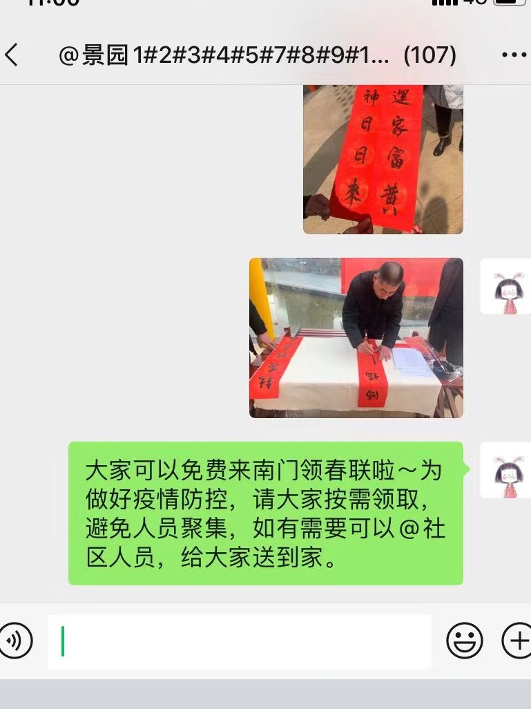 2月3日,為做好社區(qū)防疫工作,周口市城鄉(xiāng)一體化示范區(qū)景園社區(qū)一改往年現(xiàn)場(chǎng)寫、集中送的免費(fèi)送春聯(lián)活動(dòng)形式,把“寫春聯(lián)”與“送春聯(lián)”分開,通過(guò)微信群向社區(qū)居民展示書法愛好者的春聯(lián)作品,讓居民在線挑選,按需有序領(lǐng)取,避免人群聚集。同時(shí),針對(duì)社區(qū)老年人等行動(dòng)不便群體,主動(dòng)送春聯(lián)上門,確保送“?!迸c防疫兩不誤。