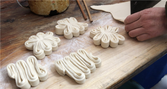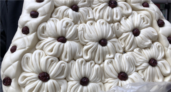 除了平常的白面饅頭,黃師傅還讓妻子現(xiàn)場(chǎng)展示了“棗山”制作,并介紹了棗山的寓意和習(xí)俗?!澳憧催@棗山是一層一層的,寓意著步步登高,而且棗山的花形是圓的,代表著團(tuán)團(tuán)圓圓。過去出嫁的閨女過年回娘家要帶大饃,娘家要回棗山,現(xiàn)在咱們周口的一些地方還保留著這樣的習(xí)俗?!眱晌恢鞑ンw驗(yàn)了棗山的制作過程,得到黃老板妻子的夸獎(jiǎng):“中!這倆妮兒可巧!”