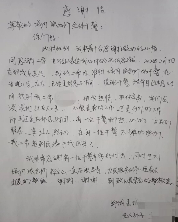 家屬告訴民警,老人去年剛做完手術(shù),身體存在一點(diǎn)問(wèn)題。民警告知老人家屬今后要看管好老人,謹(jǐn)防走失,并為老人建立易走失人員檔案,以備兄弟單位使用,老人家屬對(duì)城內(nèi)派出所表示感謝并寫(xiě)了一封感謝信。