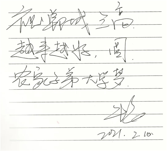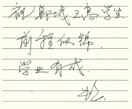 朱婷雖然很少回家,但是一直關(guān)注老家鄲城的發(fā)展變化,特別關(guān)注鄲城的教育發(fā)展,當(dāng)她得知鄲城三高率先提煉出“孝、勤、韌、忠、濟(jì)”為核心的朱婷精神,并把這種精神作為鄲城三高學(xué)子的精神引領(lǐng)時(shí)非常感動(dòng),為鄲城三高始終堅(jiān)持立德樹(shù)人的教育理念而高興,為鄲城三高學(xué)子的拼搏進(jìn)取精神而欣慰,為鄲城三高辦學(xué)成果而點(diǎn)贊,并欣然寫(xiě)下:“ 祝鄲城三高越來(lái)越好,圓農(nóng)家子弟大學(xué)夢(mèng);祝鄲城三高學(xué)生前程似錦,學(xué)業(yè)有成?!?/p>