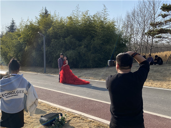 優(yōu)美的景色不是市民享受春光的好去處,也是拍攝婚紗照的好地方?!袄掀趴坷瞎稽c、再近一點,微笑、嗯不錯?!币粚π氯苏谂幕榧喺?,紅色的婚紗與自然的風(fēng)景融在一起,盡顯新娘的美麗。在植物園里,拍一組森系風(fēng)格的婚紗照很是漂亮,春風(fēng)將“調(diào)色板”打翻,一對新人的甜蜜愛情就這樣被定格在這春天里。