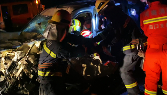由于面包車內(nèi)有被困人員,需要消防救援人員到達(dá)現(xiàn)場使用專業(yè)破拆工具進(jìn)行救援。示范區(qū)消防大隊(duì)接警后立即調(diào)派2部消防車10名指戰(zhàn)員前往現(xiàn)場。指戰(zhàn)員到達(dá)現(xiàn)場后利用搶險救援車對事故車輛進(jìn)行牽引,擴(kuò)大救援空間以便對被困司機(jī)進(jìn)行施救,同時利用破拆工具將面包車進(jìn)行破拆便于解救被困小女孩,當(dāng)晚8時39分,兩人被救出并移交于醫(yī)護(hù)人員接受進(jìn)一步治療。③5