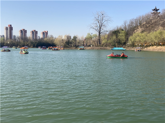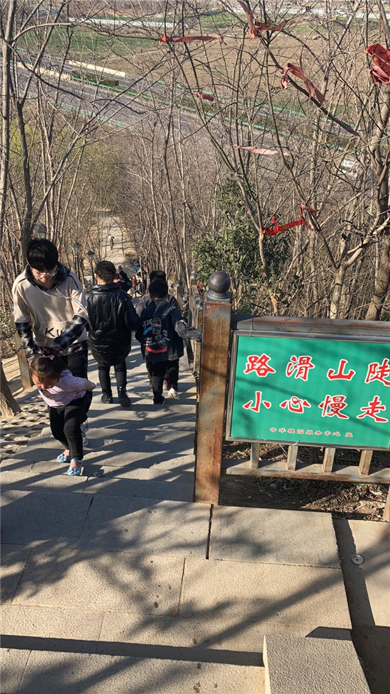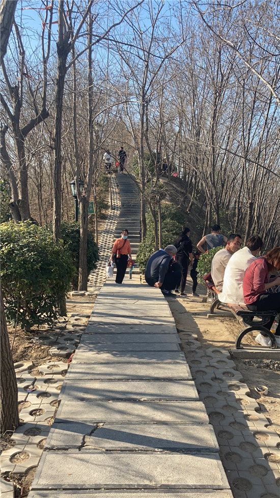 在槐香湖邊,年輕人三五結(jié)伴登上游艇,“坐船能到湖那邊的小島,島上也有槐樹,拍照肯定特別漂亮。”返鄉(xiāng)大學(xué)生把七星島上的景色留在了自己的相機(jī)里。七星島與槐香湖相連的橋上,人潮擁擠,有的人席地而坐,觀賞著橋上的風(fēng)景。當(dāng)問道在外市工作的王先生游玩感受時(shí),他回答到:“年后上班沒時(shí)間鍛煉身體,今天我把全家人帶來登山,呼吸一下新鮮空氣。”③5