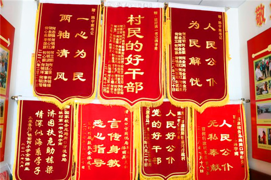 路修好了,村民為韓宇南送來(lái)了第一面錦旗。在以后的幾年里,群眾多次自發(fā)給韓宇南送來(lái)錦旗,近40面錦旗重重疊疊掛滿(mǎn)了村委會(huì)的整個(gè)北墻。