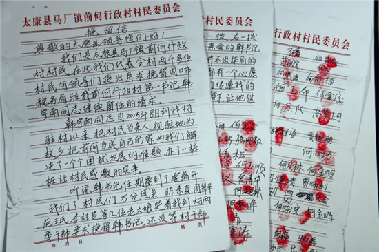 2018年,組織上考慮到韓宇南已經(jīng)在第一書(shū)記的崗位上工作了3年多,決定換他回原單位工作。前何村的群眾聽(tīng)到這個(gè)消息后,多次前往馬廠鎮(zhèn)政府請(qǐng)?jiān)福罅粝马n宇南繼續(xù)擔(dān)任前河村支部書(shū)記,何心功等99位村民還向國(guó)家稅務(wù)總局周口市稅務(wù)局、太康縣委縣政府寫(xiě)了一封“挽留信”,并按下了99個(gè)鮮紅的手印。