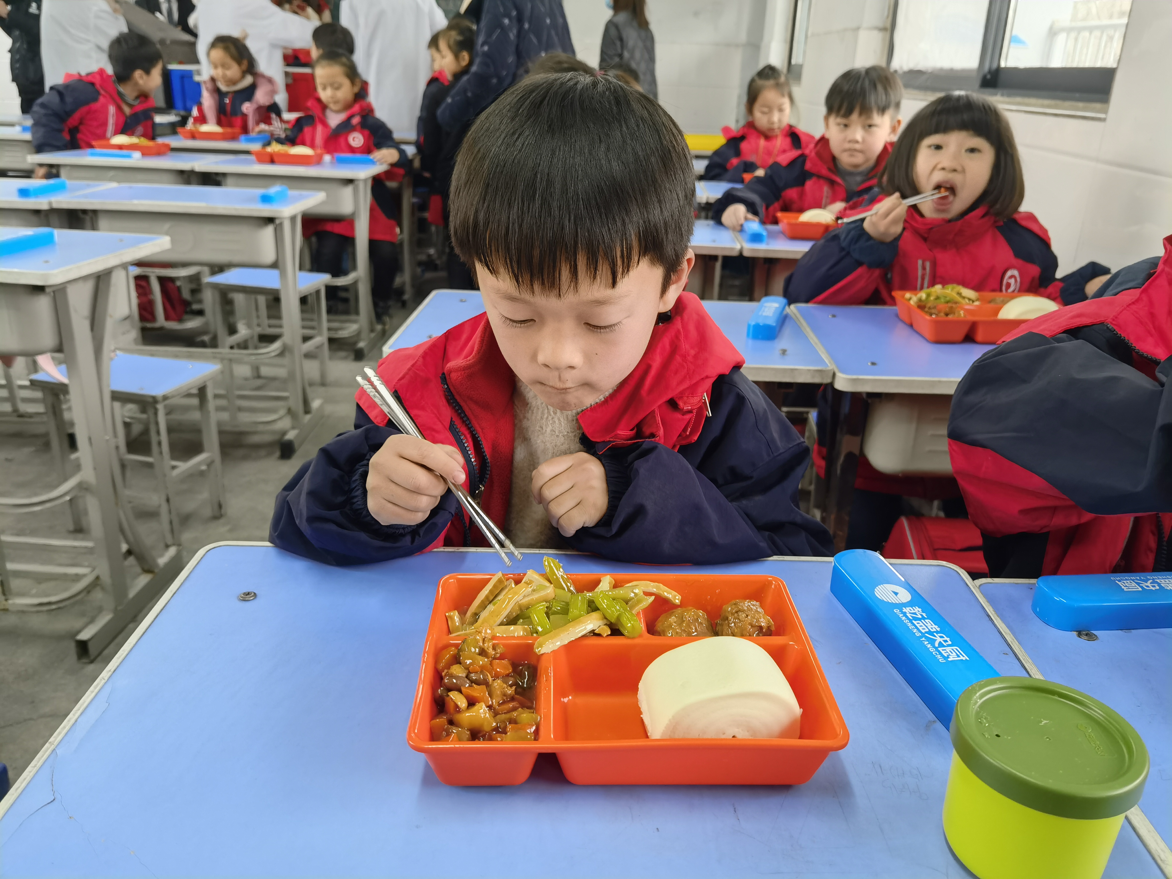 七一路二小校長邵在斌說:“中午配餐和延時服務(wù)是市委、市政府實實在在的惠民工程。為了做好這項工作,我們前期去鄭州參觀學(xué)習(xí),回來按照文件精神去做。中午配餐解決很多問題,一是家長接學(xué)生難,輔導(dǎo)作業(yè)難的問題,我們中午配有語文老師,晚上配有數(shù)學(xué)老師給學(xué)生輔導(dǎo)作業(yè)。二是延緩了學(xué)校周邊交通壓力。三是能保證學(xué)生休息時間,為了配合延時服務(wù),我們的上課時間從8點調(diào)整到8點30分,但開門時間還是7點20分,方便上班早的家長送學(xué)生。本次送餐1200多份,每班用餐時兩名教師在崗,吃完飯后留一名老師輔導(dǎo)學(xué)生。今天我們?nèi)珕T監(jiān)督配餐,領(lǐng)導(dǎo)全部在崗,校長分包樓,中層領(lǐng)導(dǎo)分包層,責(zé)任到人,保證每個孩子用餐安全,讓每位家長都安心?!雹?