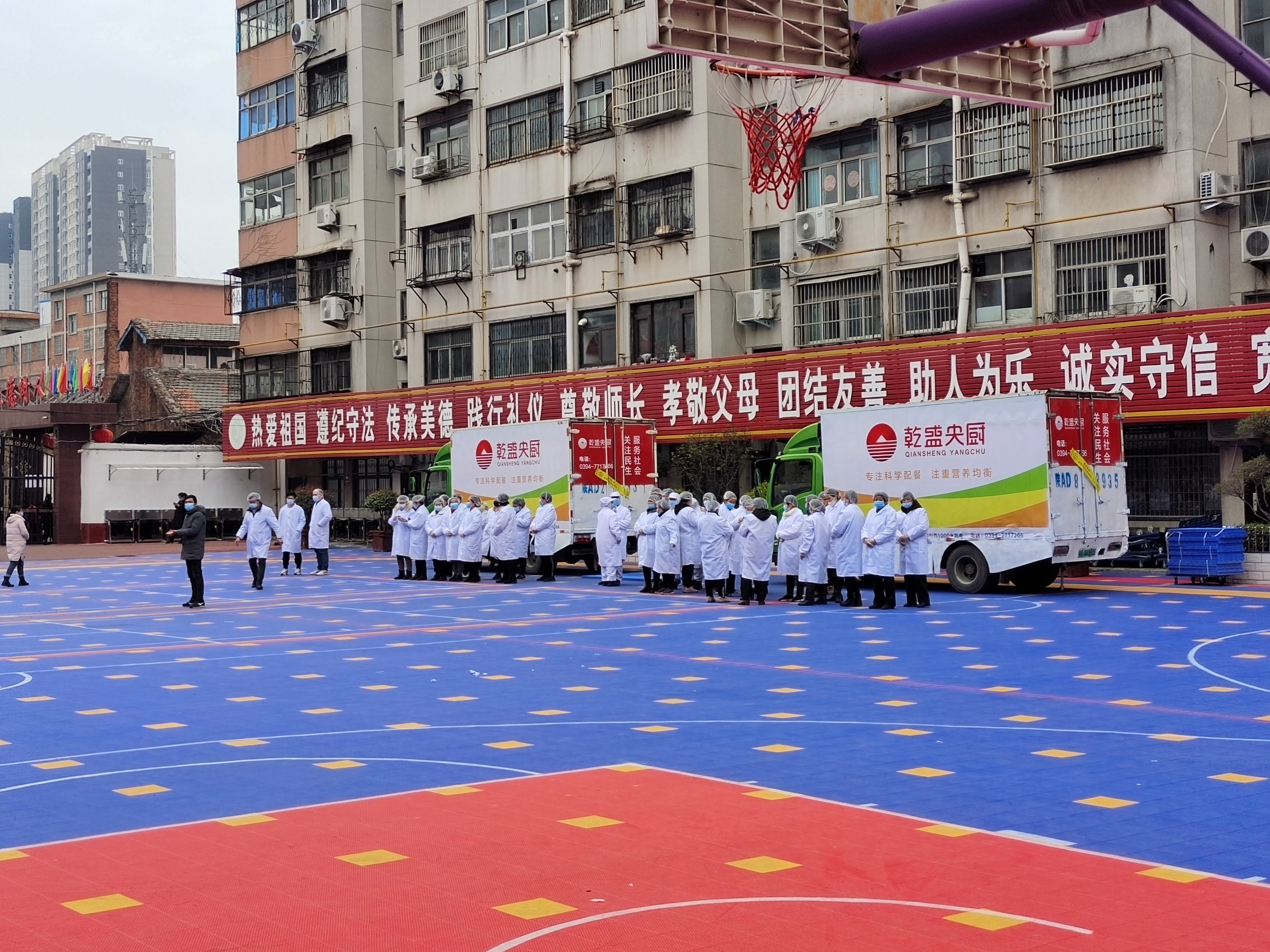 11時許,13000余份熱騰騰的飯菜即將送到周口市中心城區(qū)中小學(xué)生手中,直播團(tuán)隊對七一路二小的配送情況進(jìn)行現(xiàn)場直播。兩輛運(yùn)餐大卡車,20余名工作人員整裝待發(fā),乾盛央廚鄭州總公司的營銷部負(fù)責(zé)人現(xiàn)場指揮調(diào)度七一路二小的發(fā)餐工作。揭掉卡車上的封條,留樣,測溫,裝車,按班分送,分發(fā)不銹鋼餐具,“哇!獅子頭??!”在孩子們的驚呼聲中,兩葷一素,一份米一份湯,熱氣騰騰地盛到孩子手中的餐具中?!昂⒆觽兂圆怀缘娘栄??”面對各直播平臺上網(wǎng)友的提問,乾盛央廚鄭州總公司營銷部負(fù)責(zé)人回答:“我們提前有準(zhǔn)備,飯、菜我們都免費(fèi)加,保證孩子們都吃飽,請家長朋友們放心?!?/p>