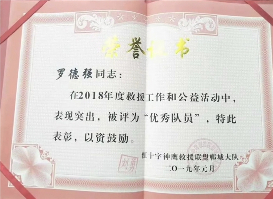 鄲城縣神鷹救援隊隊長劉勇說,正是看到了羅德強的優(yōu)秀品質,2018年將羅德強吸納為神鷹救援隊員。“神鷹救援聯盟鄲城大隊隸屬于中國神鷹救援隊,由各個行業(yè)的志愿者組成,也是河南省成立最早的一支民間救援隊,除參加全國各地災后救援活動外,日常積極參加社會志愿者活動?!薄拔乙粋€人的力量很有限,加入這個優(yōu)秀集體,能夠學到更多專業(yè)救援知識,從而幫助更多的人,我感到非常驕傲和自豪?!绷_德強說。2019年8月10日,受第九號臺風“利奇馬”影響,山東省壽光市、東營市等部分地區(qū)遭受洪災。8月11日晚上,紅十字神鷹救援聯盟鄲城大隊趕赴山東壽光救災。面對洪災,羅德強和其他救援隊員不畏辛苦,劃船深入各個受災鄉(xiāng)村救助被困群眾。壽光市一鄉(xiāng)鎮(zhèn)3處大閘因斷電出現險情,需要人力進行開閘泄洪。羅德強和隊員冒險攀爬到大閘上進行人工作業(yè),經過3個多小時的奮戰(zhàn),3處大閘全部打開,安全泄洪。2019年9月1日,參加泳渡日月潭返程途中,羅德強在福建高速公路上,發(fā)現前方車輛發(fā)生車禍,一名司機腿部骨折、血流不止。他立即下車和司機溝通,一邊報警,一邊利用專業(yè)救援知識打開變形的車門,順利將司機救出。“由于過度驚嚇,司機以骨折為由拒絕下車。當我告訴司機自己是神鷹救援隊員、救援技術過硬后,才同意我們施救。”當時高速上車流密集,情況十分危險,如果司機不能及時救出,后果不堪設想?!拔覀冘囕v加油、住宿、吃飯等救援費用都是隊員AA制負擔,從來不給當地政府或救助人添任何麻煩?!?/p>