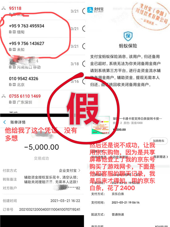 在3個(gè)多小時(shí)的通話里,輕信了騙子的小輝,接連被對(duì)方以需要“退回理賠款”和提供“資金流水證明”為借口,騙取了5000元錢的“樂(lè)花卡”網(wǎng)貸、2300元的花唄和999元的個(gè)人賬戶資金。由于是共享屏幕,個(gè)人信息泄露無(wú)遺,騙子還登錄了小輝的京東賬號(hào),冒充小輝與客服人員聊天,套取了京東白條2400元錢,用于購(gòu)買游戲網(wǎng)卡。