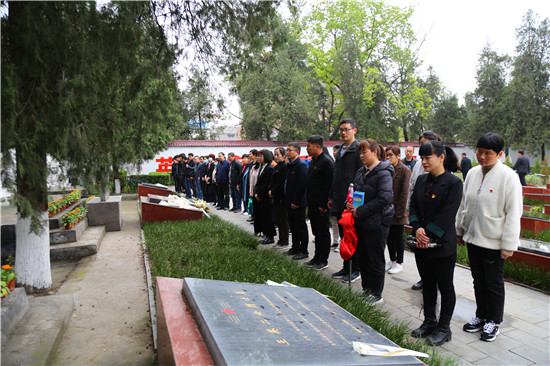 鄲城縣自然資源局黨員干部在紀念碑前重溫入黨誓詞。