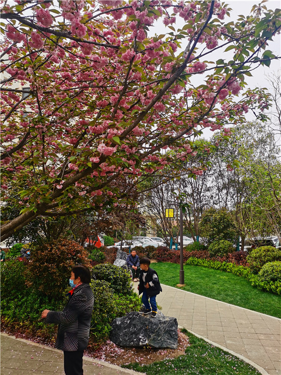 4月12日,中心城區(qū)文明路與七一路交叉口的街頭游園內(nèi),櫻花盛開,綠坪如茵,老人們?cè)谧詩(shī)首詷罚苁切腋芤狻?/p>