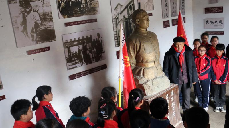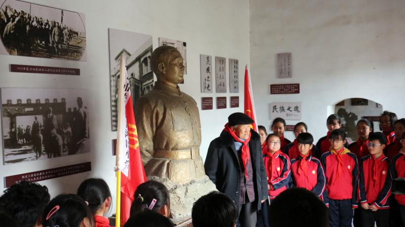 在全國上下掀起黨史學習教育熱潮之際,近日,來自吉鴻昌小學六(1)班的30名孩子,在學校少先隊輔導員的帶領(lǐng)下來到呂潭學校舊址,開展主題為“弘揚鴻昌精神、傳承紅色基因”的主題隊會活動,參觀了吉鴻昌學校和吉鴻昌故居,循著英雄的足跡,親身感受吉鴻昌精神的內(nèi)涵,接受一場紅色的精神洗禮。期間,在吉鴻昌將軍塑像前,何國志老人生動地講解了吉鴻昌將軍親手斃堂侄、創(chuàng)辦吉鴻昌學校、首次向中國人介紹電視等身前事跡,在場的孩子感動得熱淚盈眶。 “聽了何爺爺?shù)闹v述,我被吉鴻昌將軍的事跡深深感動,長大后也要成為一名像他一樣的人!”張晨曦同學說。