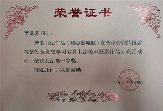 本次大賽,我市民輔警積極參加,踴躍報送,選送書法、美術、攝影作品30余件。其中扶溝縣公安局宣傳科李龍喜、交警大隊厲夯等人的書法《初心忠誠聯(lián)》《習近平講話選抄》等作品分別榮獲書法類一等獎、二等獎;扶溝縣公安局宣傳科閆曉鳳等人的攝影作品《晨讀》、《走訪話安全》等分別榮獲攝影類二等獎、三等獎。此次大賽,全面筑牢了民輔警忠誠履職的思想根基,切實把教育整頓及黨史學習教育活動的成果轉(zhuǎn)化為思想成果和工作成果。充分展示了扶溝公安堅定的理想信念和良好的精神風貌。②9