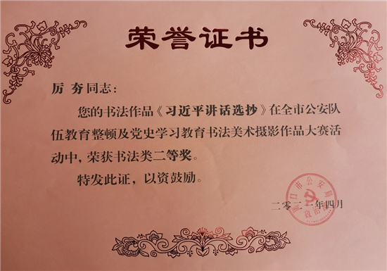 近日,扶溝縣公安局在全市公安隊伍教育整頓及黨史學習教育書法美術攝影作品大賽中榮獲優(yōu)秀組織獎,同時,該局推薦報送的多部書法攝影作品大賽中也榮獲多個獎項。其中,書法類榮獲一等獎1名、二等獎2名、三等獎1名、優(yōu)秀獎1名;美術類榮獲二等獎2名、三等獎4名;攝影類榮獲二等獎1名、三等獎1名。