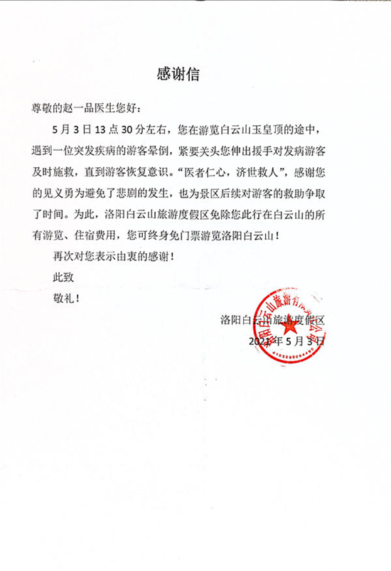 得知趙醫(yī)生見義勇為的事跡后,洛陽白云山旅游度假區(qū)對趙一品醫(yī)生送出了感謝信,免除他此行在白云山的所有游覽、住宿費用,并可終身免門票游覽洛陽白云山。