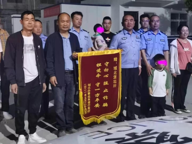 5月26日,城北辦事處朱樓村6名村民一起前往城北派出所,送上一面繡有“守初心阻止詐騙 擔使命守一方平安”鮮紅錦旗。
