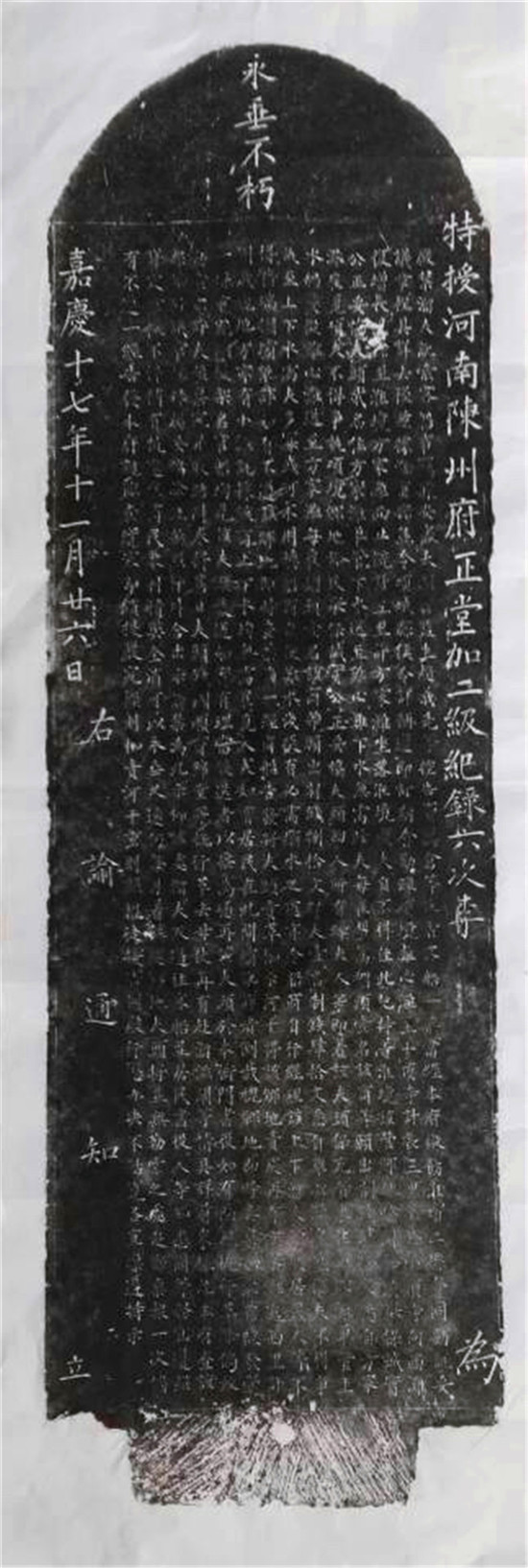 說(shuō)它“緘默不語(yǔ)”,其實(shí)并不準(zhǔn)確。這通石碑通體有字,碑的陽(yáng)面為清同治八年四月十六日淮沈項(xiàng)分縣縣丞孫茂悟所刊刻的嚴(yán)禁溜夫訛索客船事告示,碑的陰面為附文,內(nèi)容為重刊的清嘉慶十七年十一月二十六日陳州知府李振翥制定的嚴(yán)禁溜夫訛索客船事章程,是對(duì)公告內(nèi)容的重申,兩面碑文內(nèi)容大致相同,加起來(lái)共有1100余字,均為約束溜夫行為的公告或章程。碑首追刻的有四個(gè)大字:永垂不朽。