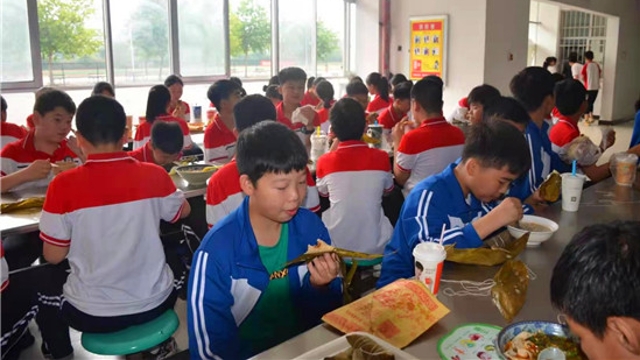 6月14日,端午節(jié),鄲城縣第二實驗中學(xué)朱玉良、李繼元等校領(lǐng)導(dǎo)在餐廳和學(xué)生一起集體過端午。
