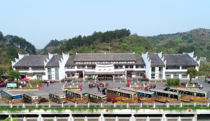 圖1:沙洲村游客服務(wù)中心前停滿大巴車,天南地北的游客慕名而來。郴州日報(bào)攝影記者 曹高林 攝