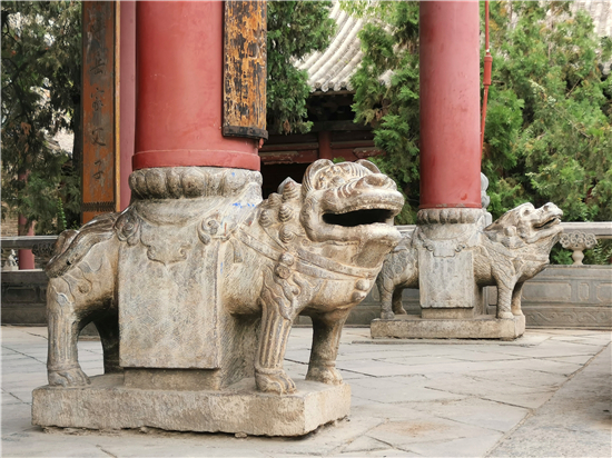 過山門,突現(xiàn)在眼前的是一對鐵旗桿。鐵旗桿高22米、重3萬余斤,且桿身鑄有銘文圖案、山水花卉、龍鳳鳥獸。
