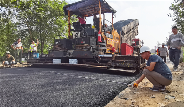 路面鋪油作業(yè)從淮陽區(qū)葛店鄉(xiāng)與鄲城縣李樓鄉(xiāng)交界處開始,一臺攤鋪機鋪設寬度為7米,壓實厚度為5厘米,以平均每分鐘5米的速度前行,數(shù)輛運料車輪流供料給攤鋪機。攤鋪機過后,兩臺壓路機交替運行,立即把路面壓實;兩臺灑水車配合作業(yè),路面一次成型,寬闊而平坦。