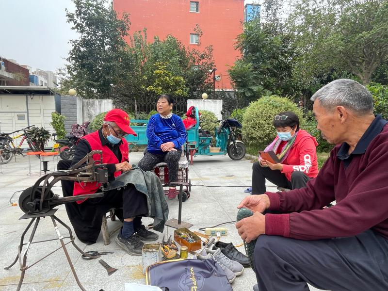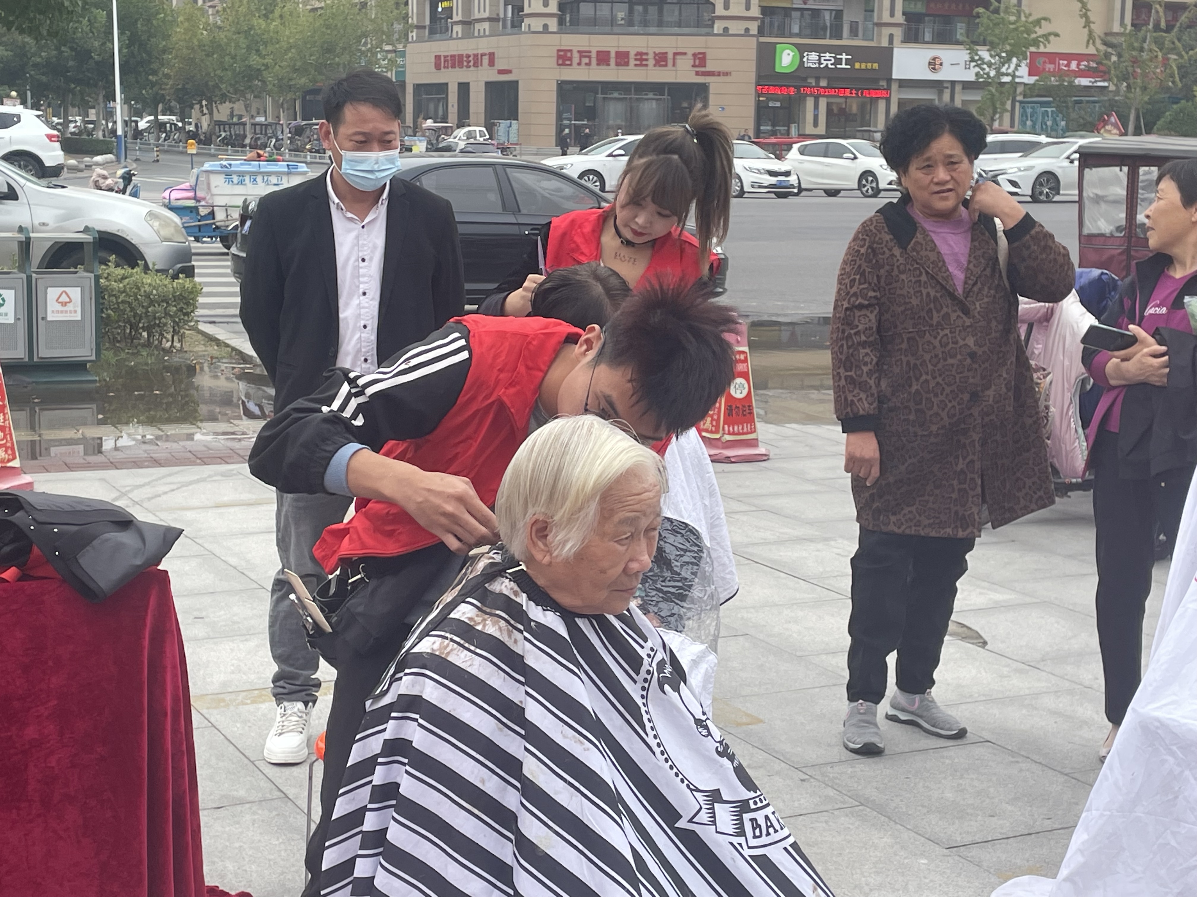 10月14日,在川匯區(qū)文昌大道的中原社區(qū)A區(qū)大門口,數(shù)十名身穿紅馬甲的志愿者在忙著幫社區(qū)老年人截褲腳、剪頭發(fā)、補鞋子。志愿者們深入社區(qū),為老年人服務。此外,他們還在蓮花路、太昊路、文明路、交通路街頭值勤,助力文明周口建設。①5