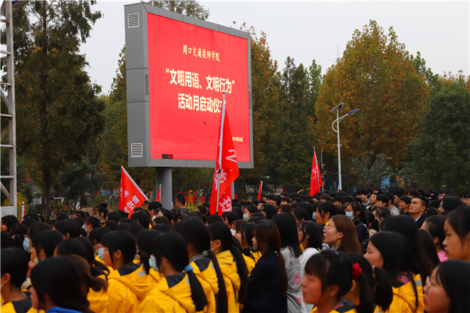 “我是周口交通技師學(xué)院的一名學(xué)生,從今天起,我要講禮儀、懂禮貌、不說臟話……積極參加“文明用語、文明行為”主題實(shí)踐活動(dòng),爭做文明學(xué)生。”10月26日,周口交通技師學(xué)院全體師生在學(xué)院“文明用語、文明行為”活動(dòng)月動(dòng)員會上集體宣誓。師生們堅(jiān)定的目光和錚錚的誓言,展現(xiàn)出青年學(xué)子講文明話、辦文明事、做文明人的堅(jiān)定決心。