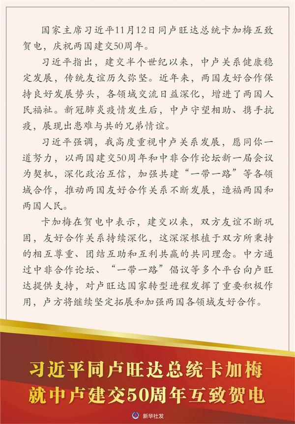 習(xí)近平同盧旺達(dá)總統(tǒng)卡加梅就中盧建交50周年互致賀電