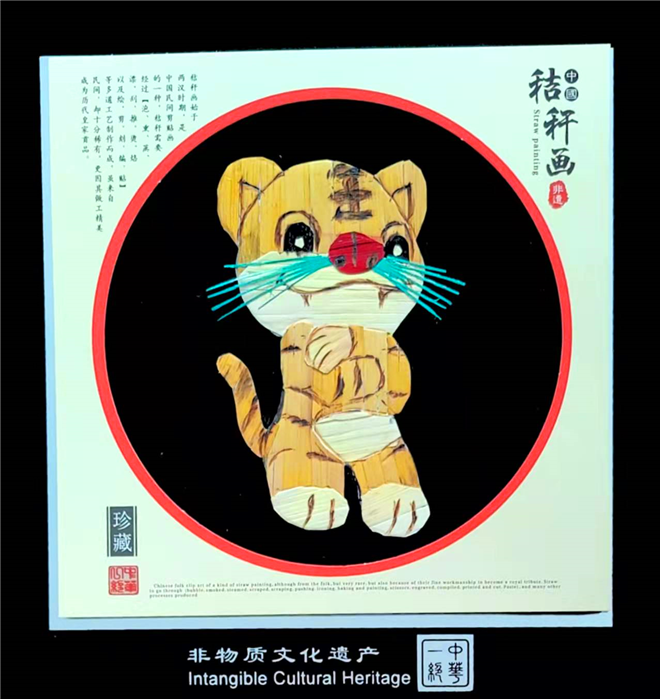 據(jù)王春梅介紹,畫中老虎身上所有的虎毛全部是用秸稈先染色,然后把這些染好顏色的秸稈用剪刀剪成人頭發(fā)絲一半粗細的虎毛形狀,再用鑷子一根一根地層層嵌上去,需要盤絲的毛發(fā)所花費的功夫更是成倍地增加。最終所呈現(xiàn)出來的老虎栩栩如生,極具觀賞性。