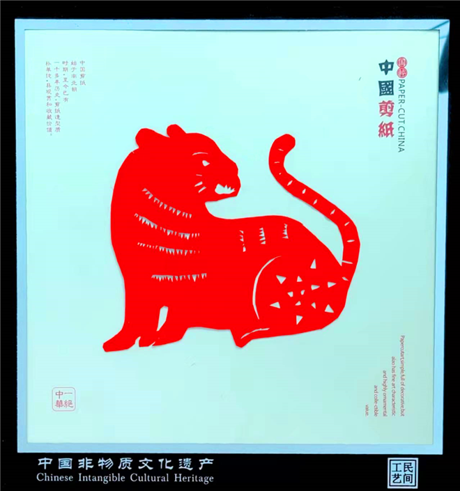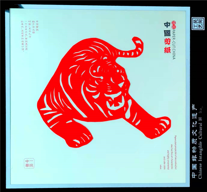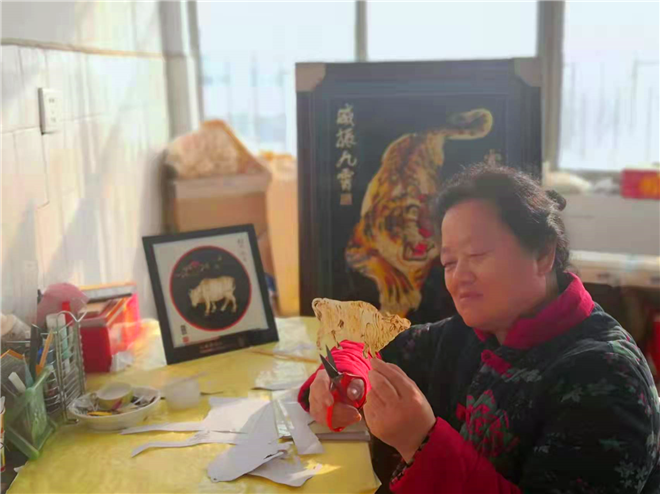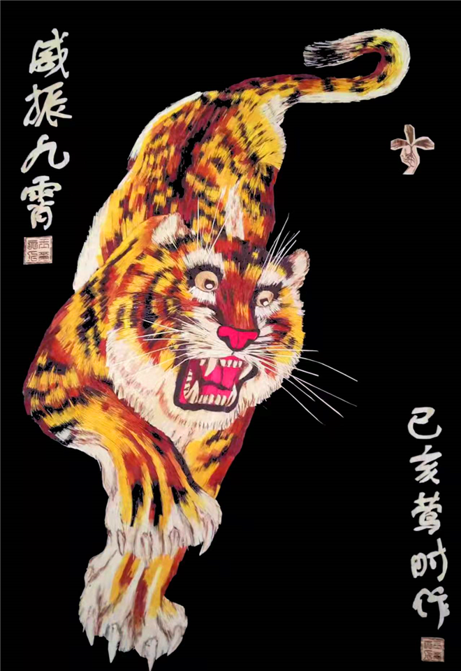 為了慶?;⒛辏醮好穭?chuàng)作的秸稈畫主要有《威震九霄》《虎之王者》《飛天神虎》等,此外,她還創(chuàng)作了兩幅剪紙作品,分別是《虎年組圖》和《虎之2022》。和剪紙作品相比,秸稈畫制作工序更加復(fù)雜,全憑手工完成,充分利用秸稈本身的紋理和質(zhì)地,結(jié)合顏色、溫度的變化,將畫面立體的呈現(xiàn)出來。其中,她創(chuàng)作的部分作品結(jié)合了唐卡的相關(guān)風(fēng)格和顏色配比,比如《威震九霄》中虎的形象所表現(xiàn)出來的力量感借鑒了唐卡中護法的力量感;《虎之王者》和《虎之2022》中對于藍色的運用結(jié)合了唐卡中的藍色,代表了永恒不變,如同穹蒼攬護萬物之意。