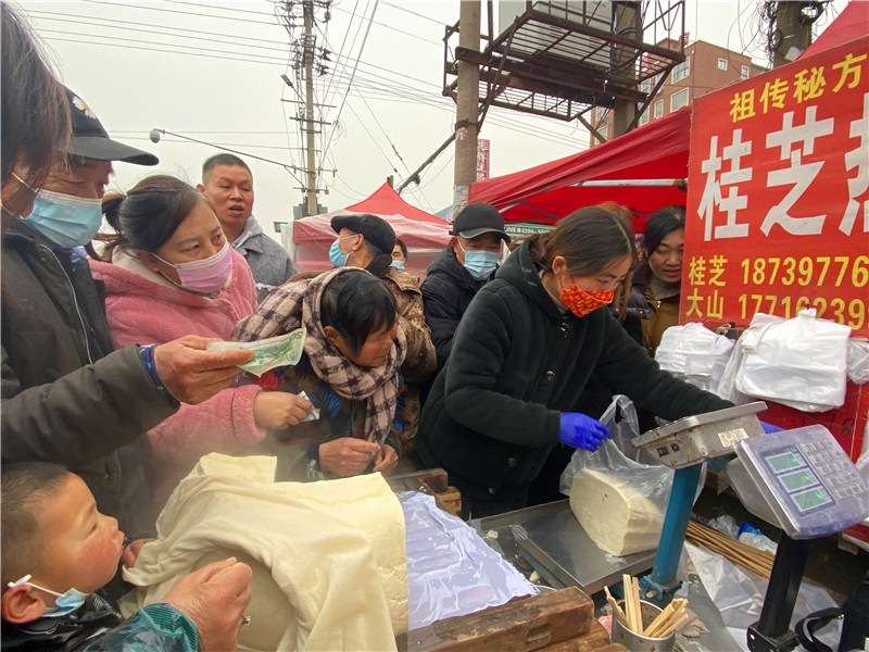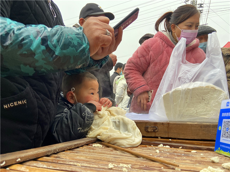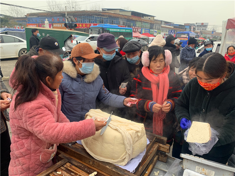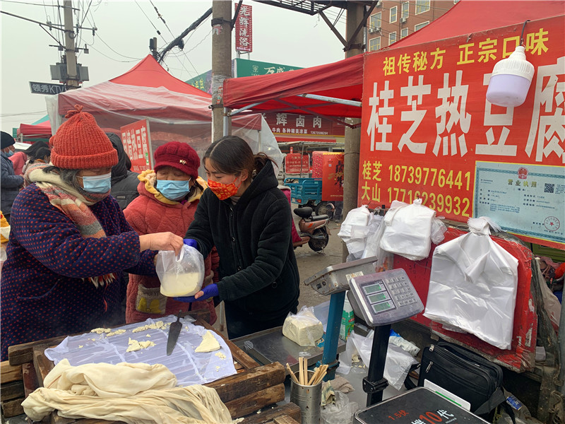 在固墻鎮(zhèn)的集市上,“桂枝熱豆腐”攤位前的顧客絡(luò)繹不絕?!敖o我來(lái)50塊錢的豆腐”“我要20斤,先給我切豆腐吧”“我要30斤,多少錢”……人群將豆腐攤里三層外三層圍了起來(lái),從人群外朝里看看不見豆腐,只看到豆腐攤里冒出來(lái)的團(tuán)團(tuán)熱氣?!暗攘税雮€(gè)小時(shí)了,剛才那一盒豆腐沒輪到我就賣完了,這才搶到手。”附近的村民楊大爺拿著剛買的豆腐高興地說(shuō)?!拔覐穆挂貋?lái)的,姐姐在里面擠著買豆腐,我在這兒等她呢?!?歲的張家瑞說(shuō),她每年放寒假都會(huì)和家人一起到固墻來(lái)探親,過(guò)年的時(shí)候逛逛集市,順便買些豆腐帶回鹿邑。