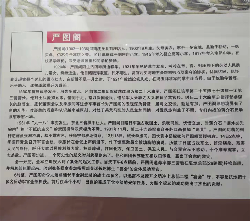 據(jù)了解,為了緬懷革命先烈,嚴(yán)圖閣烈士犧牲之地——湖南平江蘆頭已被打造成為紅色黨性教育基地。(相關(guān)文字報(bào)道及視頻,周口報(bào)業(yè)傳媒集團(tuán)將陸續(xù)推出。)③2