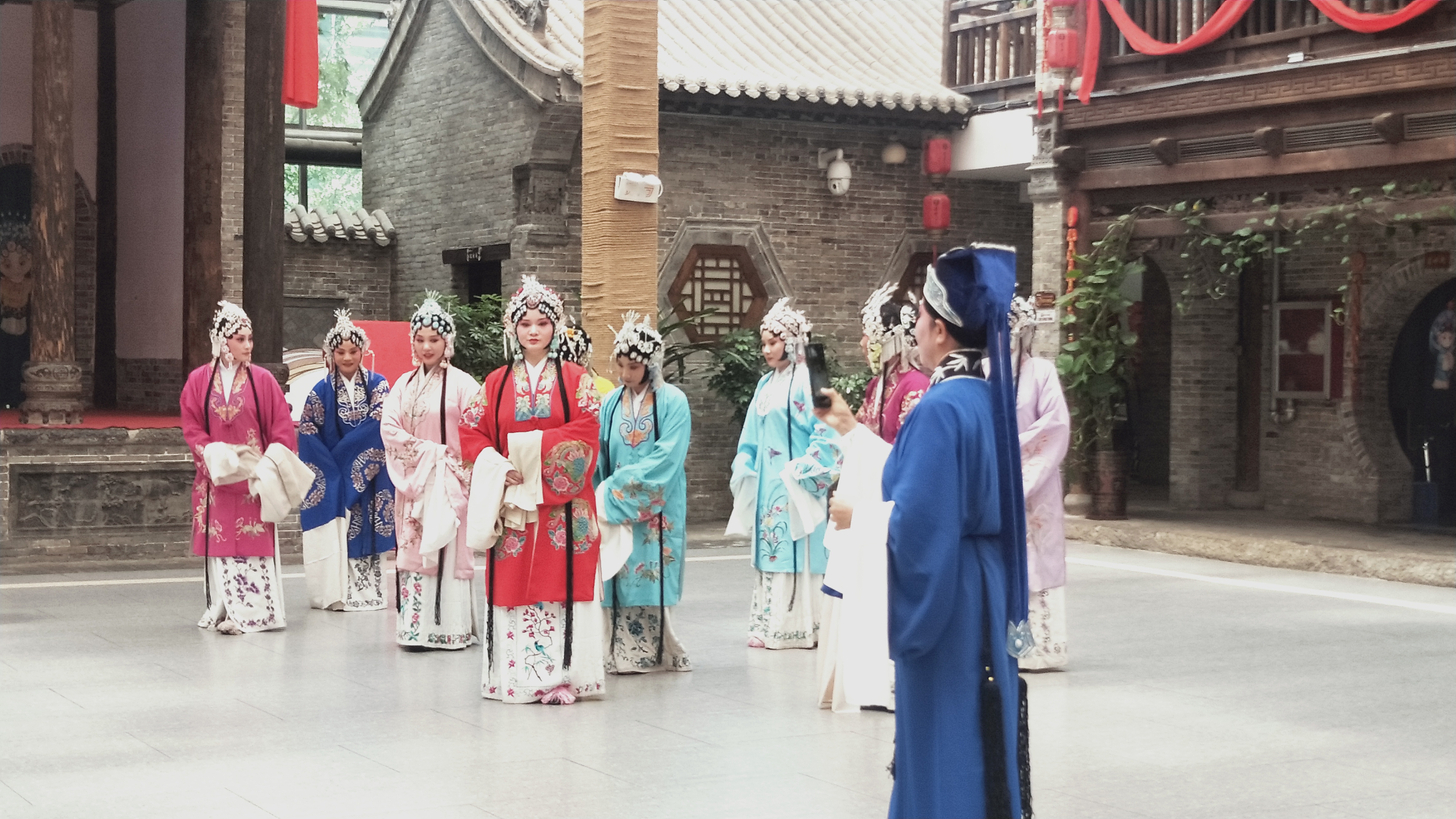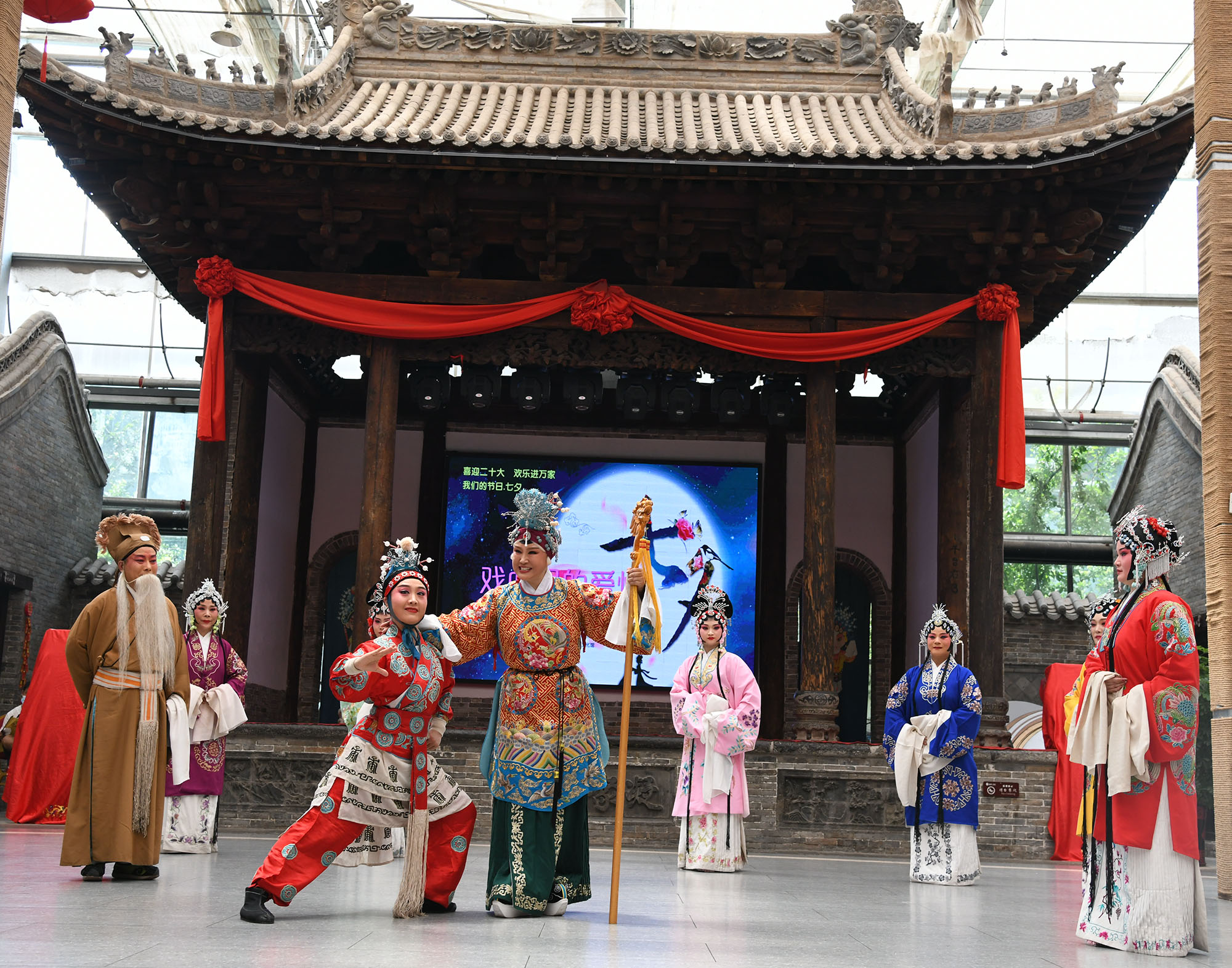 ?8月3日上午,市豫劇團(tuán)團(tuán)長(zhǎng)、戲劇藝術(shù)家肖秀蓮帶領(lǐng)演員們?cè)诮I(yè)大食堂演出《五世請(qǐng)纓》中的《一家人歡天喜地》一折。