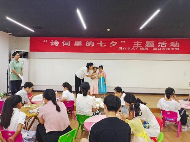 七夕今宵看碧霄,牽??椗珊訕颉?月20日,一場(chǎng)別開(kāi)生面的“詩(shī)詞里的七夕”主題活動(dòng)在周口市圖書(shū)館青少年活動(dòng)中心舉行。書(shū)香覓詩(shī)詞、同心題詩(shī)詞、粘土畫(huà)詩(shī)詞……參與的孩子在詩(shī)情畫(huà)意中感受到中華傳統(tǒng)節(jié)日的內(nèi)涵。