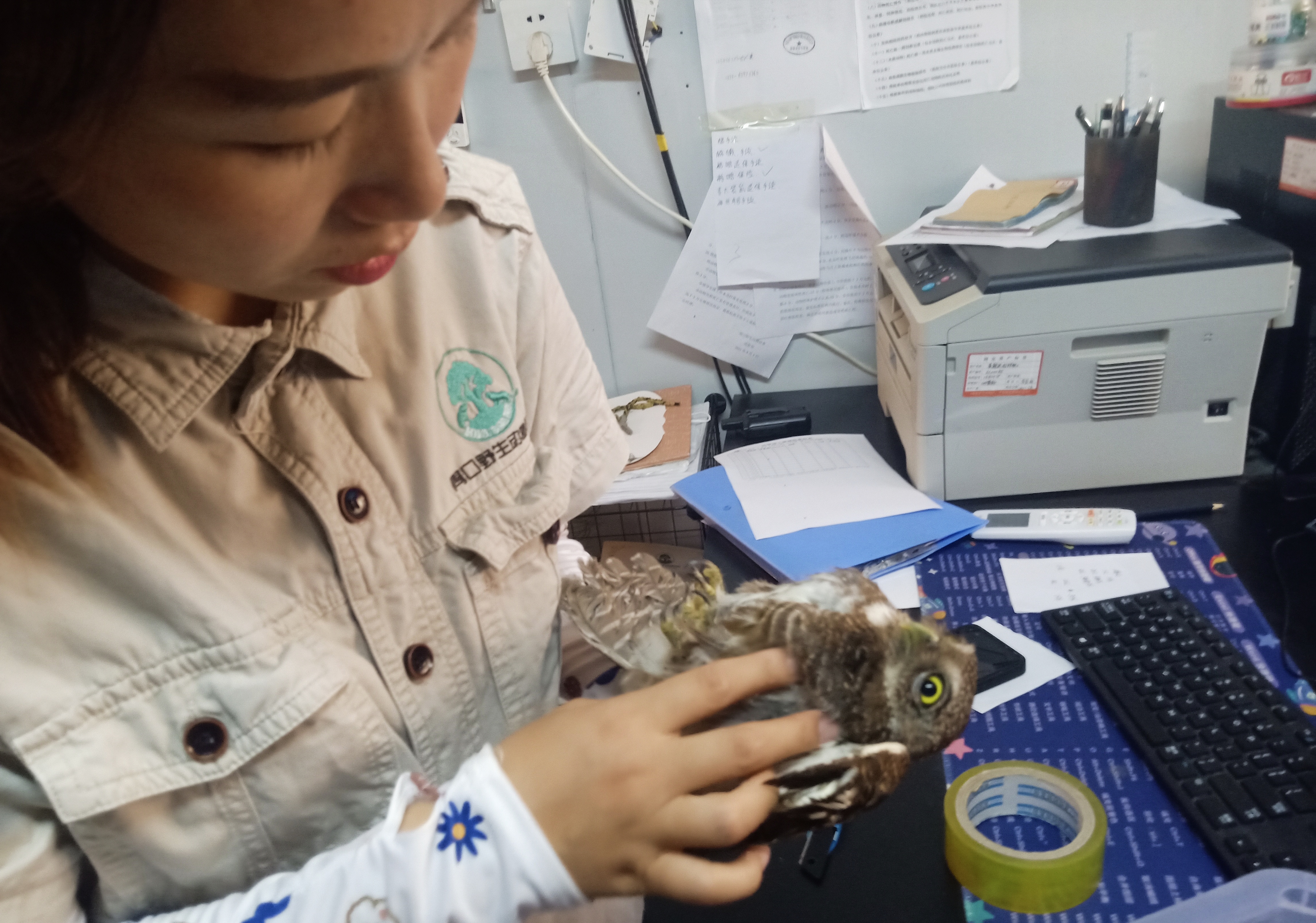 8月14日9時(shí)許,天氣炎熱,項(xiàng)城市公安局水寨派出所一民警駕車(chē)來(lái)到項(xiàng)城市自然資源和規(guī)劃局,向野生動(dòng)物保護(hù)人員張向忠現(xiàn)場(chǎng)移送一只受傷的斑頭鵂鹠。