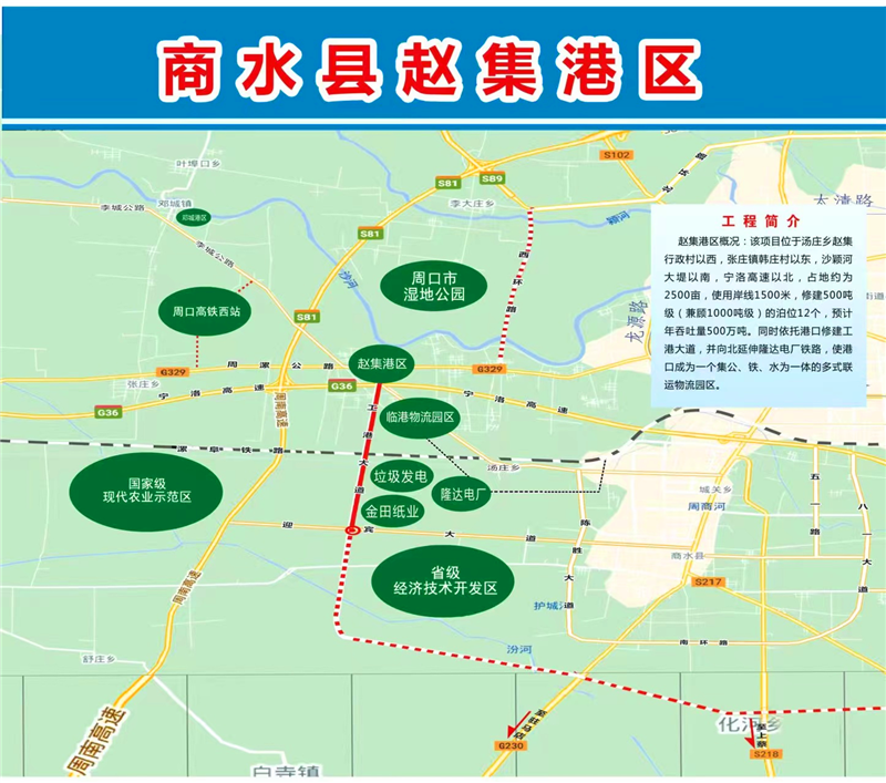 2017年,商水縣政府按照前瞻30年、謀劃15年、做實近5年工作要求,開始規(guī)劃修建位于湯莊鄉(xiāng)趙集行政村以西,張莊鎮(zhèn)韓莊村以東,沙潁河大堤以南,寧洛高速以北的趙集作業(yè)區(qū)。規(guī)劃建設占地約720畝、總投資6.37億元的趙集港項目,同時修建12個1000噸級泊位,其中散貨泊位8個,通用泊位2個,多用途泊位2個,占用岸線1250米,預計年吞吐量達475萬噸。碼頭采用順岸式布置,結構采用重力式扶壁結構,前沿配置30噸門座式固定吊裝卸作業(yè)。港口涵蓋貨物拆解區(qū)、散件堆放區(qū)等4個功能區(qū),集裝箱露天堆場、大型貨車停車場等5個場地。圍繞趙集港,高標準規(guī)劃建設占地約6.2平方公里的多式聯(lián)運臨港經濟園區(qū),下設金田紙業(yè)、建材倉儲兩個物流園區(qū),涵蓋建材及建材制品園區(qū)、造紙業(yè)原料及成品園區(qū)、紡織服裝原料及成品園區(qū)3個功能園區(qū)。該項目建成投入使用后,不但能加快商水縣紡織園區(qū)、循環(huán)園區(qū)、經濟開發(fā)區(qū)、隆達電廠等企業(yè)物質的流轉,而且能使商水港成為周口沙潁河重要的鐵運、陸運、水運交通樞紐、貨物貿易和物流中轉聚集區(qū),從而進一步促進商水經濟的健康、快速發(fā)展。