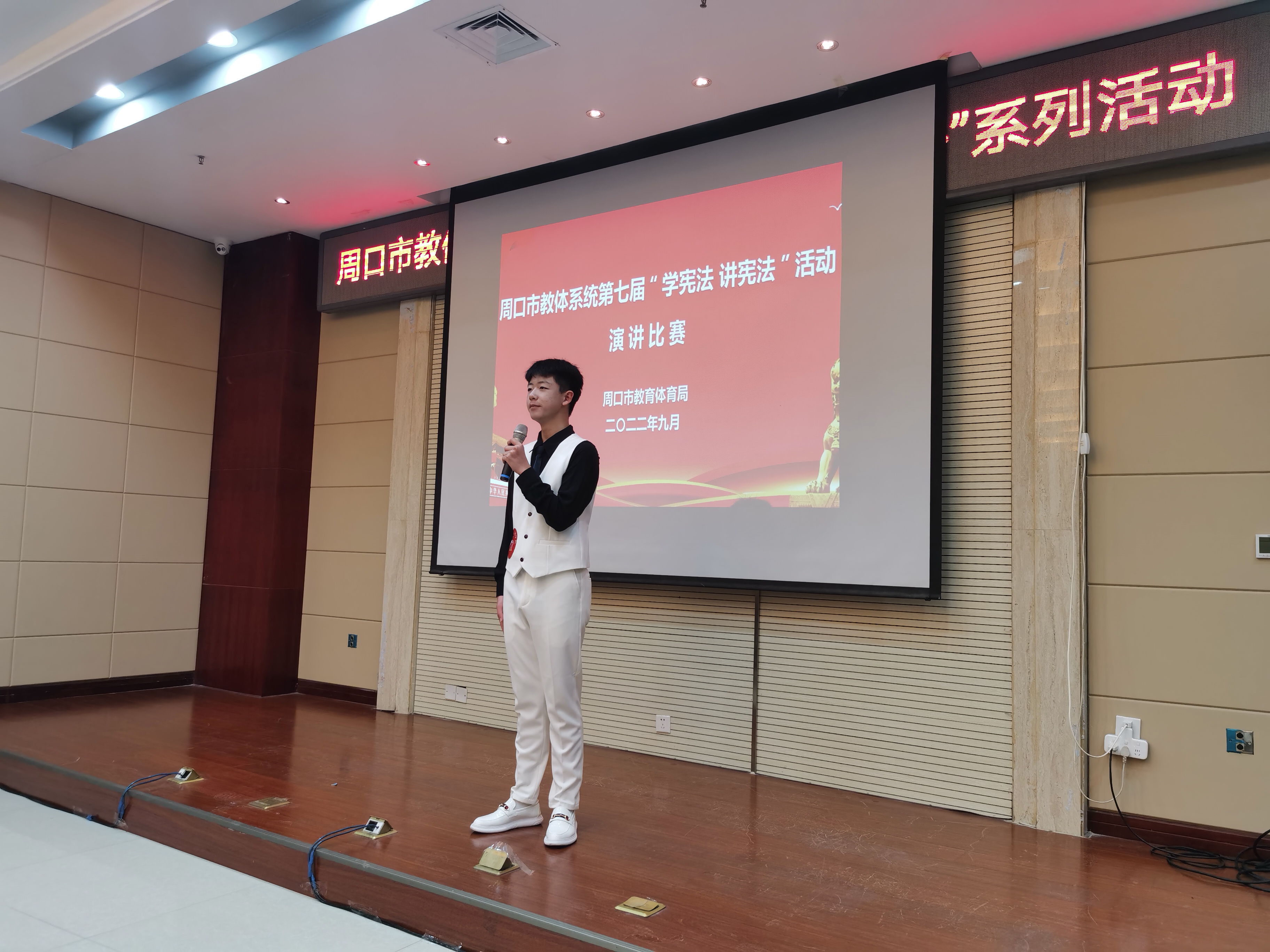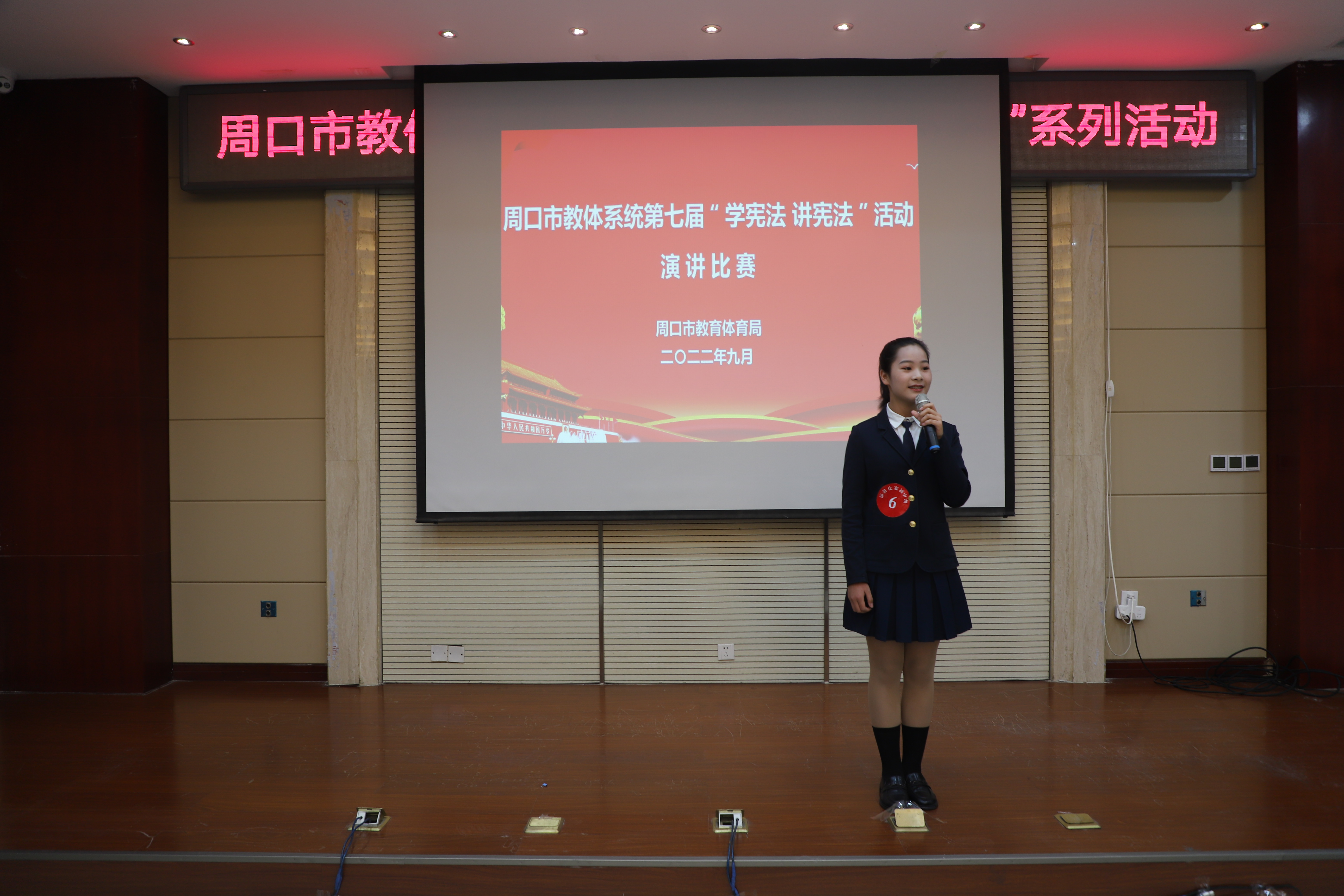 為進(jìn)一步弘揚(yáng)憲法精神,推進(jìn)廣大中小學(xué)生憲法學(xué)習(xí)教育活動(dòng),增強(qiáng)師生法治意識(shí),豐富師生法治知識(shí),9月21日,由周口市教體局主辦的第七屆中小學(xué)生“學(xué)憲法 講憲法”演講比賽和知識(shí)競賽舉行。