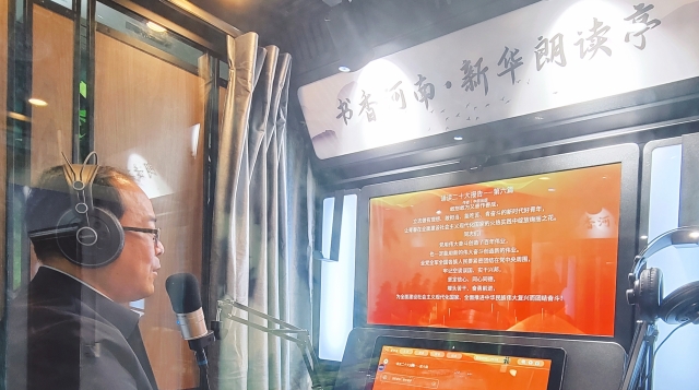 11月3日,在位于項(xiàng)城市商城路與西大街交叉口的新華書店朗讀亭內(nèi),誦讀愛好者年秋燕正在選讀黨的二十大報(bào)告原文,其深情且鏗鏘有力的誦讀聲令人如癡如醉。