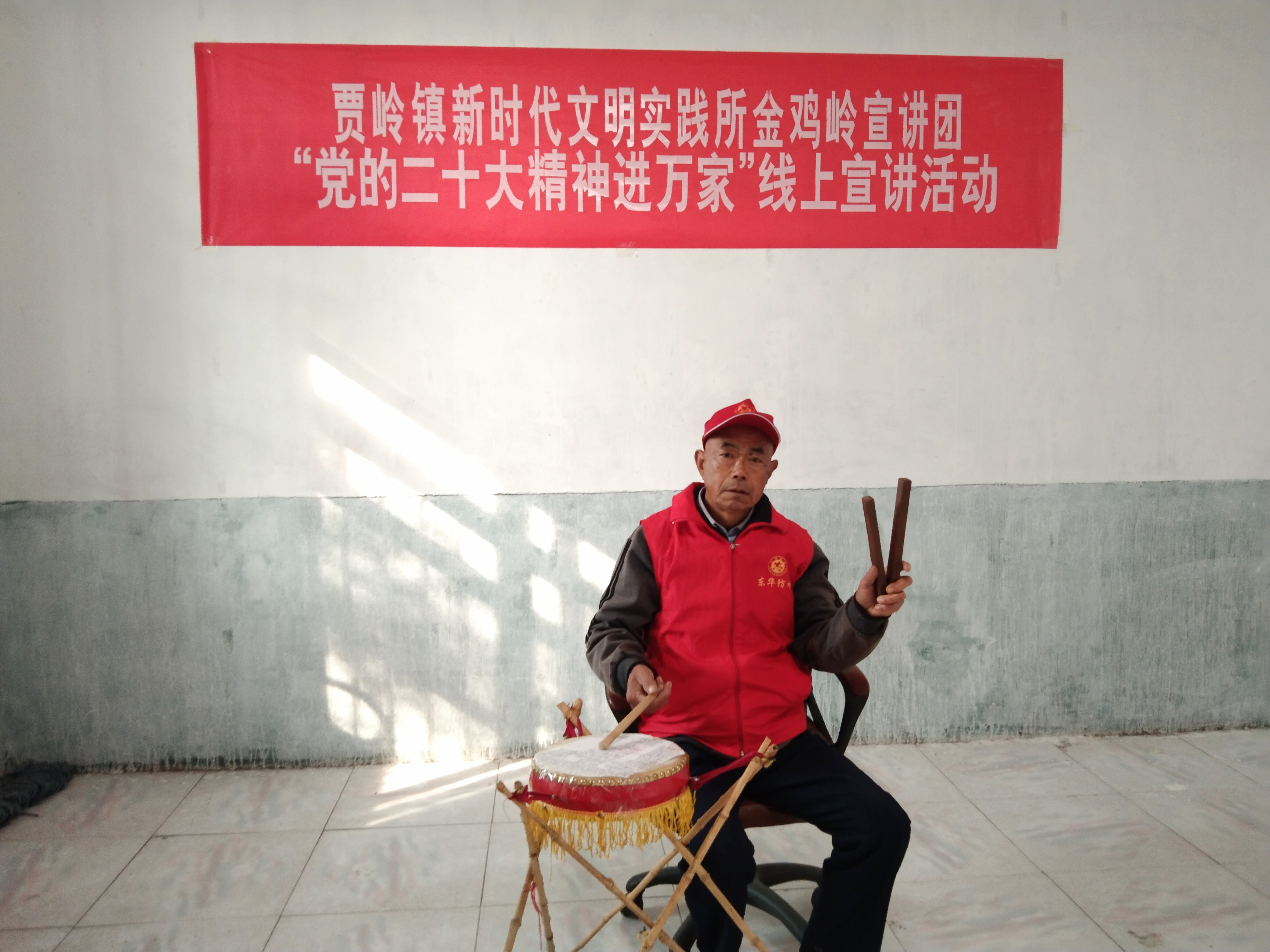 近日,項(xiàng)城市賈嶺鎮(zhèn)新時(shí)代文明實(shí)踐所金雞嶺宣講團(tuán)志愿者、七旬老人閆汝才閑暇就會(huì)坐在一張凳子上,一手敲鼓、一手夾板,配合唱腔、道白,利用非遺“大鼓書”藝術(shù)表演形式,通過抖音平臺(tái)在線上宣傳黨的二十大精神。