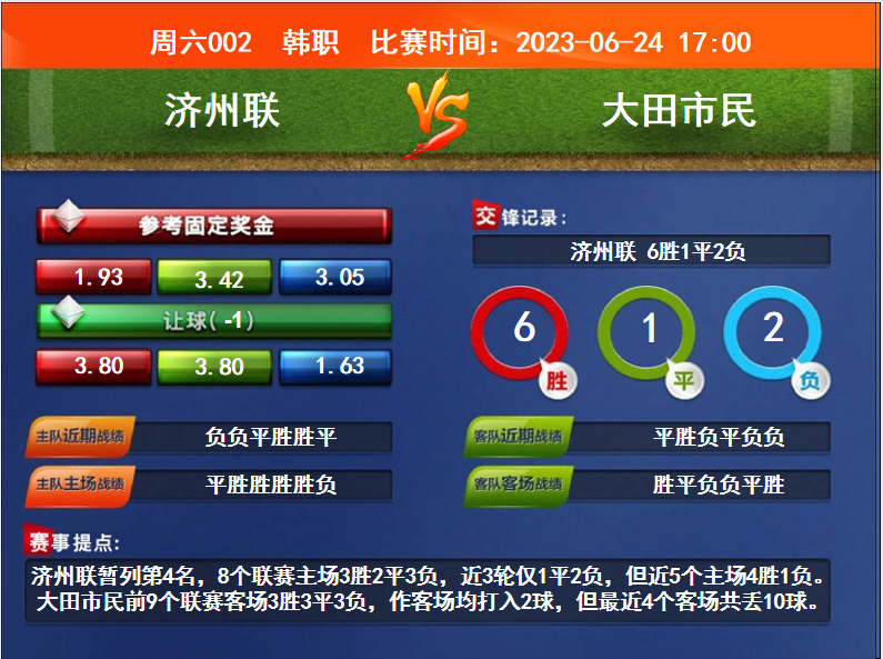 比賽時(shí)間:2023-06-24 17:00賽事提點(diǎn):濟(jì)州聯(lián)暫列第4名,8個(gè)聯(lián)賽主場(chǎng)3勝2平3負(fù),近3輪僅1平2負(fù),但近5個(gè)主場(chǎng)4勝1負(fù)。大田市民前9個(gè)聯(lián)賽客場(chǎng)3勝3平3負(fù),作客場(chǎng)均打入2球,但最近4個(gè)客場(chǎng)共丟10球。