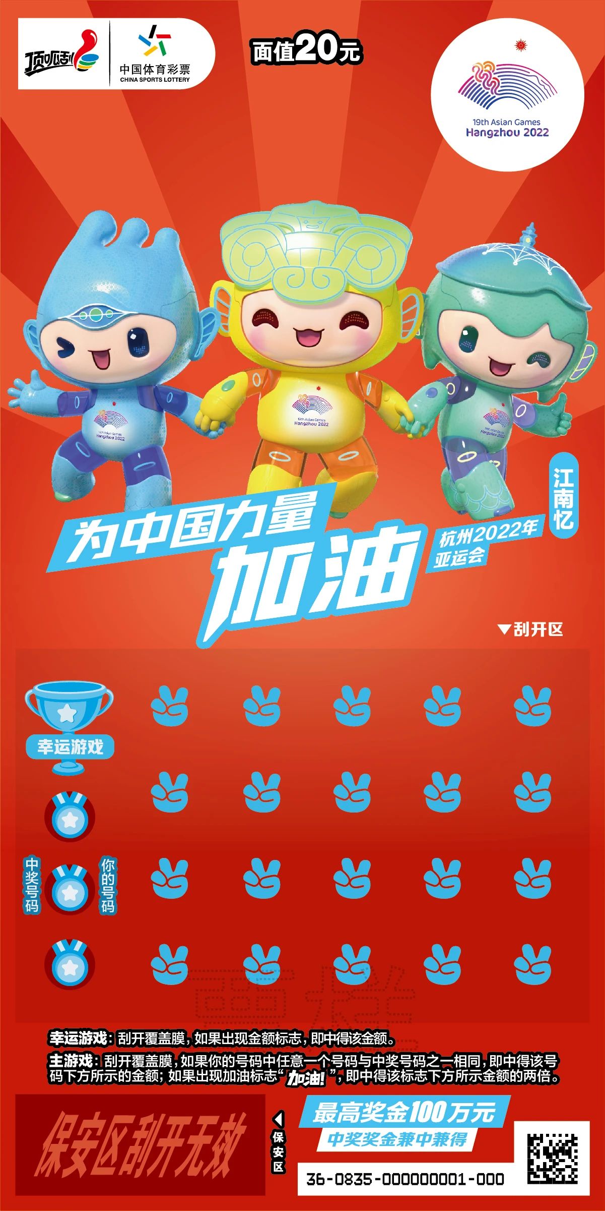 在杭州亞運(yùn)會(huì)開(kāi)幕倒計(jì)時(shí)200天之際,浙江體彩推出“為中國(guó)力量加油”杭州亞運(yùn)會(huì)主題即開(kāi)型體育彩票,票面以亞運(yùn)會(huì)吉祥物“琮琮”“蓮蓮”“宸宸”為主體形象,將具有親和力的吉祥物與充滿(mǎn)活力的網(wǎng)球、游泳、籃球、乒乓球等體育運(yùn)動(dòng)相結(jié)合,以動(dòng)感時(shí)尚形式展示亞運(yùn)會(huì)賽事項(xiàng)目。